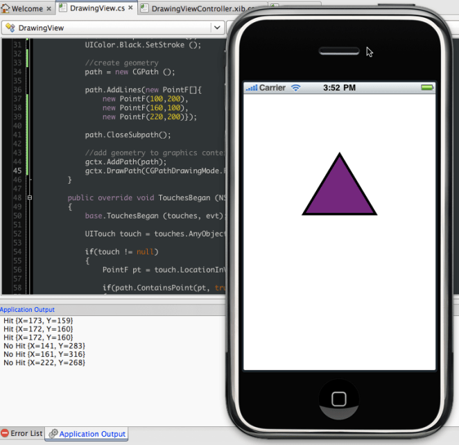 CoreGraphics allows you to do custom drawing on the iPhone. MonoTouch exposes this in the namespace MonoTouch.CoreGraphics. This allows you to do all sorts of custom drawing. Here I’ll present an introductory example that shows how to draw a triangle in a custom view along with determining if the triangle was touched. Even as drawing complexity increases, you’ll find the code to be quite similar in general, just that there will be more of it.