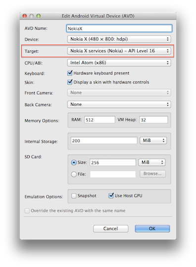 Note, when you create a Nokia X emulator, be sure to set the target to Nokia X services (Nokia) – API Level 16 as shown below: